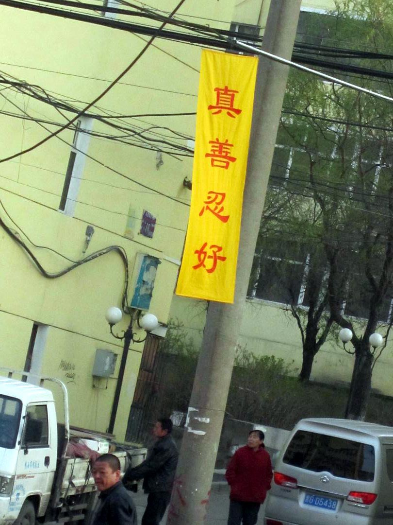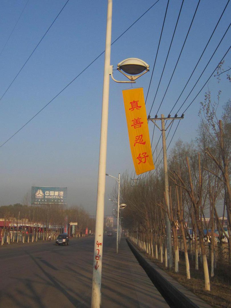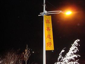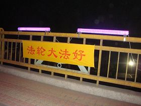 黑龙江省鸡西市大法弟子在各处街道、居民区悬挂“法轮大法好”“真善忍好”条幅,庆祝大法洪传二十周年。