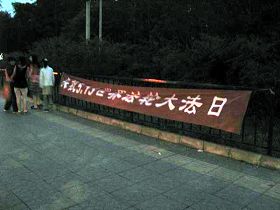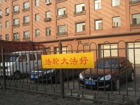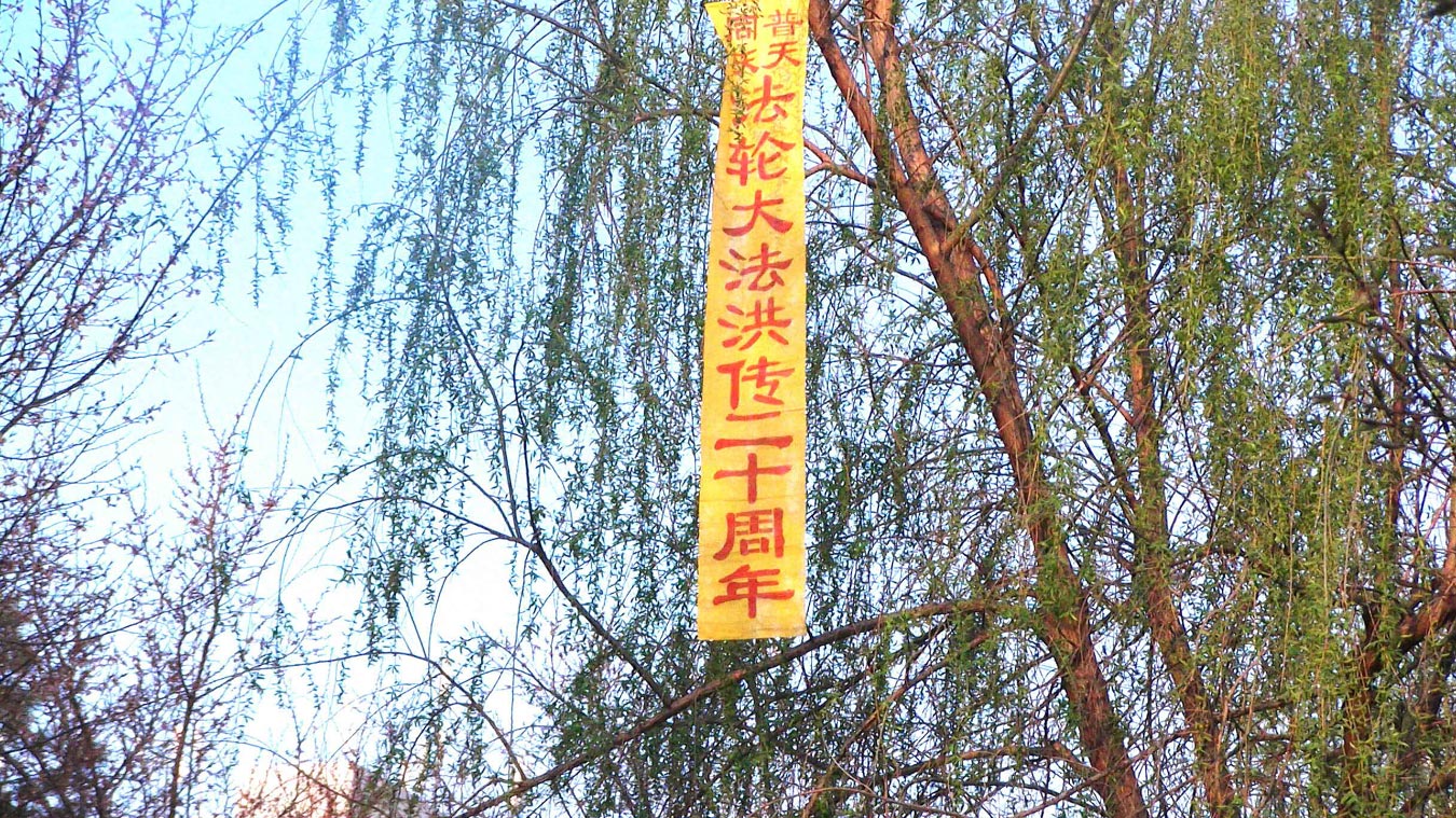 五月十三日是世界法轮大法日,今年的五月十三日标志着法轮大法洪传于世二十周年,大陆大法弟子以各种方式纪念这个神圣而庄严的日子,东北某市公园、路边和住宅小区内出现大量的真相条幅和不干胶贴。引来众多民众驻足观看,多数人一边绘声绘色的念着条幅上的每一个字,一边发出不同以往的感叹,“法轮功了不起!”特别是对于“法办江罗刘周”的条幅,更是倍感兴致。有的还故意询问“这几个人是谁呀”,有的在回答问题。真的会感到环境在变,世人在觉醒。