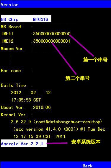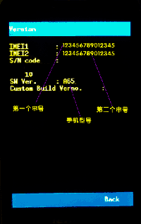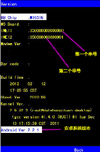 按“菜单(MENU)”键,“IMEI1”和“IMEI2”后面的数字就是串号,下图分别是MT6516和MT6573芯片手机显示的画面。