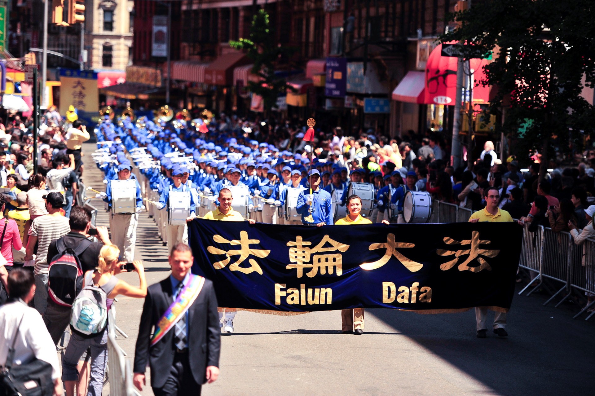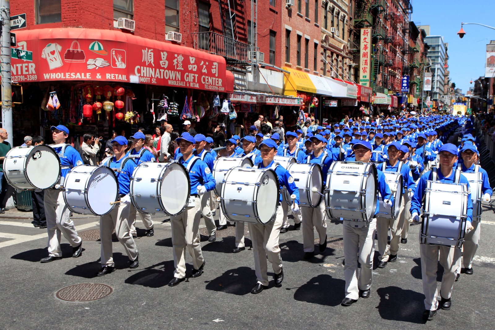 盛大游行队伍由三百多名法轮功学员组成的天国乐团开道,雄壮的《法轮大法好》、《法鼓法号震十方》、《法正乾坤》、《送宝》和《法轮圣王》等曲目震撼人心。巨大的法轮功书籍的模型在阳光下熠熠发光,身着仙女装的仙女队飘然而至,犹如步入仙境,舞狮舞龙队喜庆吉祥。由台湾法轮功学员组成的庞大的炼功方阵,向人们演示着法轮功的功法,整齐祥和,宁静超然。