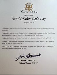 因此,我,美国国会众议员约翰•葛拉曼迪加,来自利福尼亚州第十选区,特此祝贺第十三届“世界法轮大法日”。