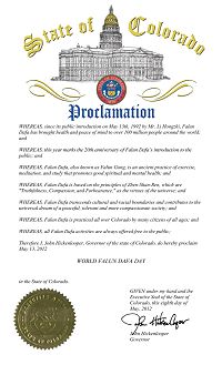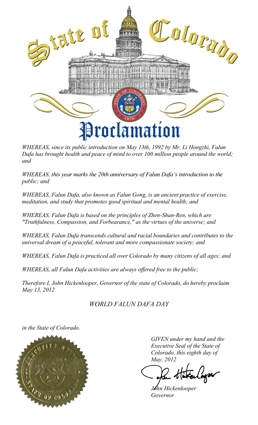 在此,我,约翰·希肯鲁柏(John Hikenlooper),科罗拉多州州长,郑重宣布二零一二年五月十三日为科罗拉多州的