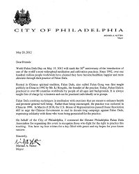 我谨代表费城市,向大费城法轮大法学会举办这次活动予以表彰,支持那些为修炼这个功法而争取权利的人们。我衷心祝愿法轮大法日充满和平,希望你们未来成功。