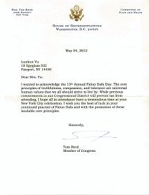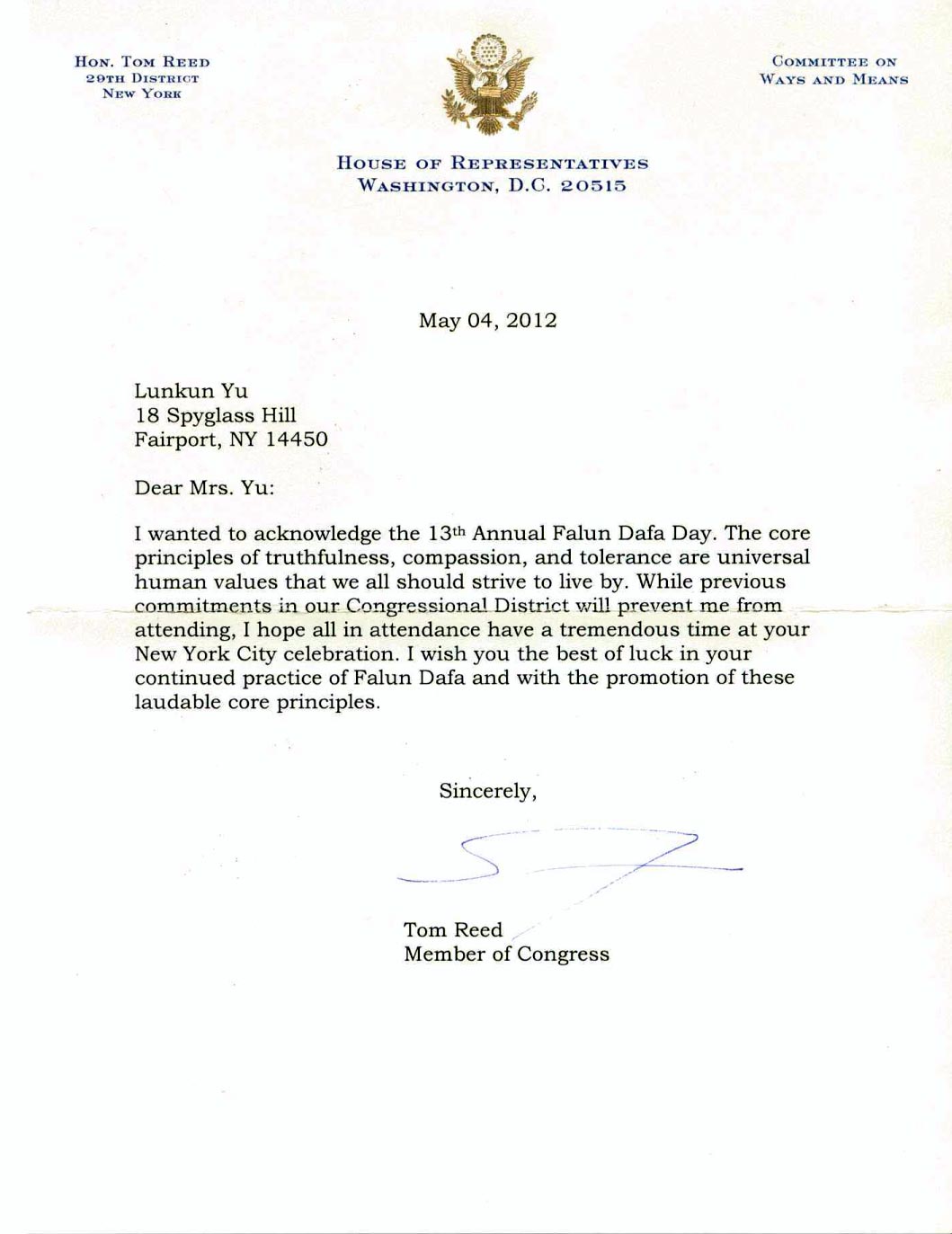 【明慧网二零一二年五月十三日】美国首都华盛顿国会议员汤姆·里德(Tom Reed)二零一二年五月四日致信当地法轮功学员,祝贺法轮大法日。