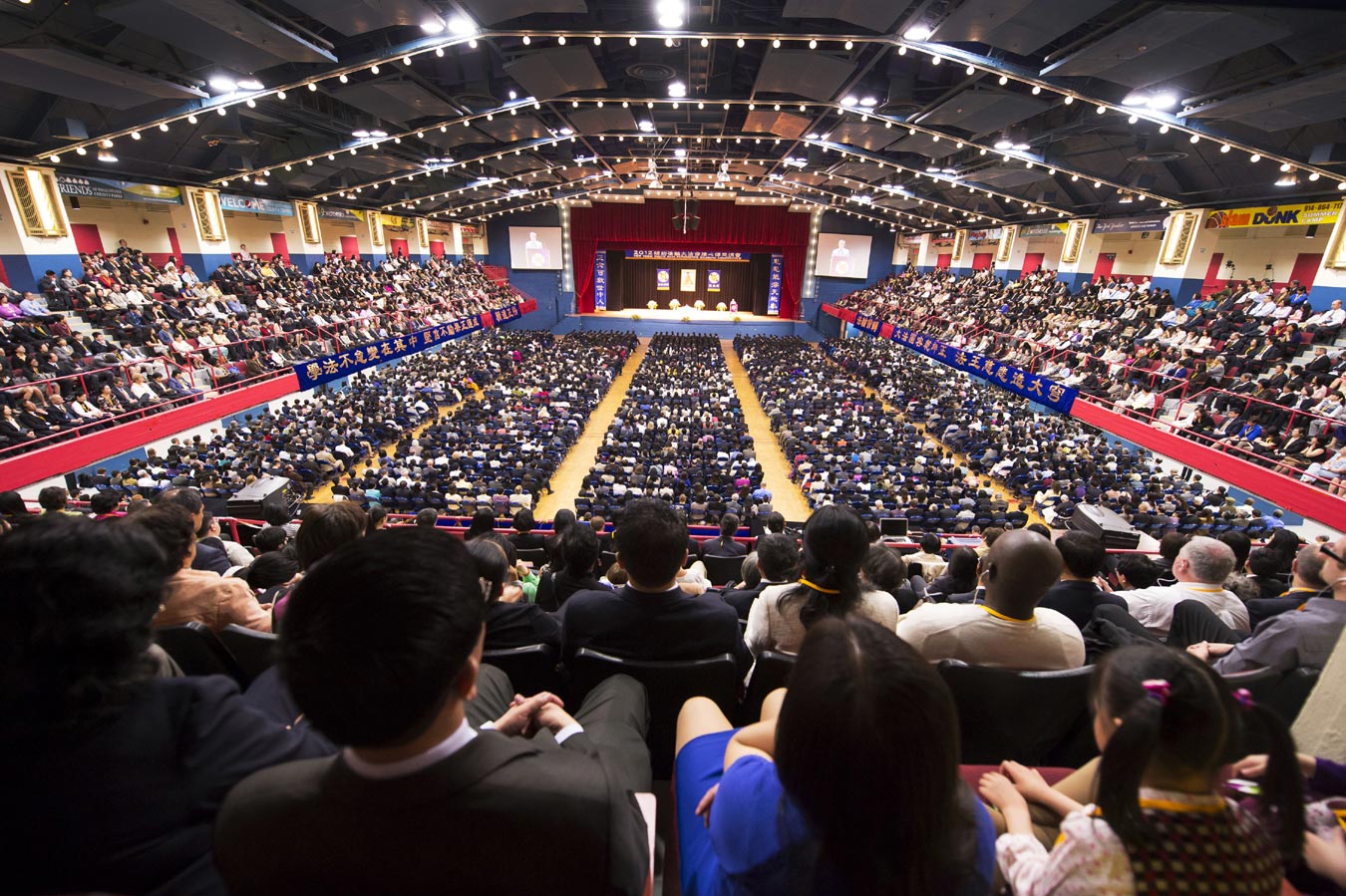 由于前来参加法会的人数众多,法会分为主会场和多个分会场。在主会场的主席台上鲜花芬芳,正中是师尊大法像,两边是写有“法轮常转”和“真善忍”的法轮图形。“正念可救世中人”、“慈悲能溶天地春”的竖幅悬于两边。面对主席台,左侧是横幅“学法不怠变在其中,坚信不动果正莲成”和“精進正悟”;右侧是“大法圆容乾坤正,法王慈悲造大穹”和“法轮常转”,后面是“真善忍”。