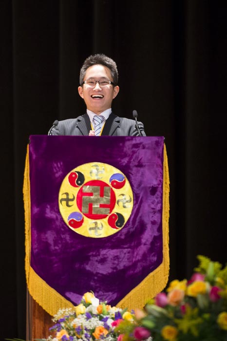 法会开始,主持人代表全体参加法会的大法弟子和全世界大法弟子及芸芸众生恭祝慈悲伟大的师尊生日快乐。