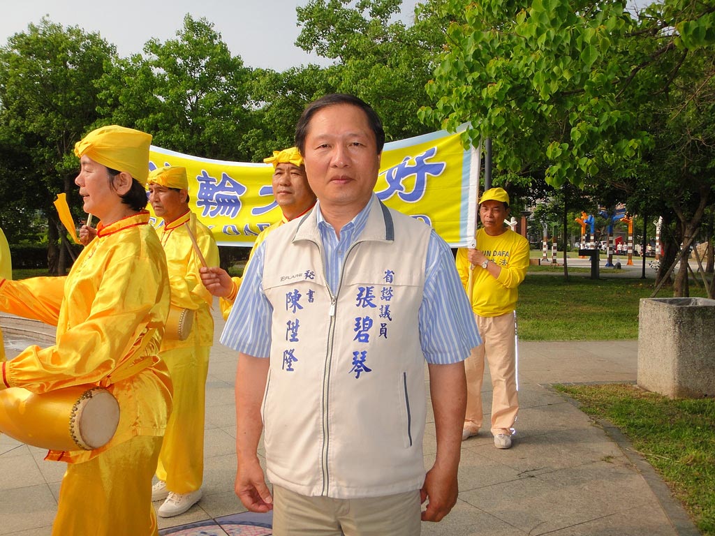 游行活动未开始前,省諮议员张碧琴机要秘书陈陞隆先生,在第一时间抵达活动现场,向法轮功学员致意,并交代警局分局长给予最大的协助。他表示,今天行程很多,特地先来法轮功活动现场表示支持,他认为法轮功给人们带来道德提升、以及正面的影响,所以给予百分百的支持。