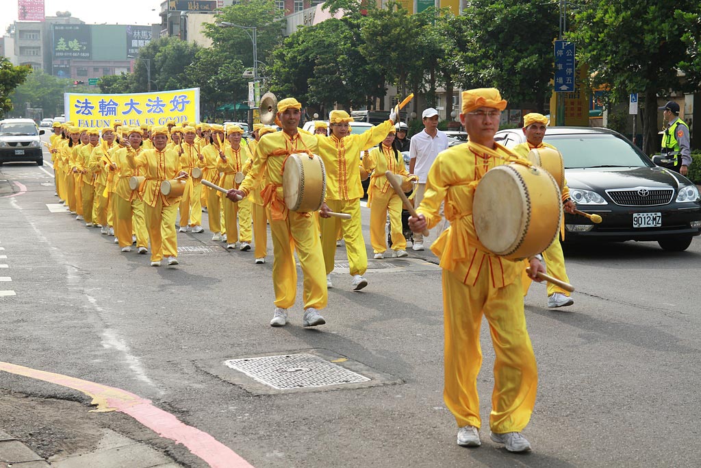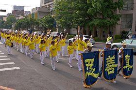 ![]() 由法轮功学员组成的天国乐团,站在对伍的最前端,准备开始带领队伍游行。 |