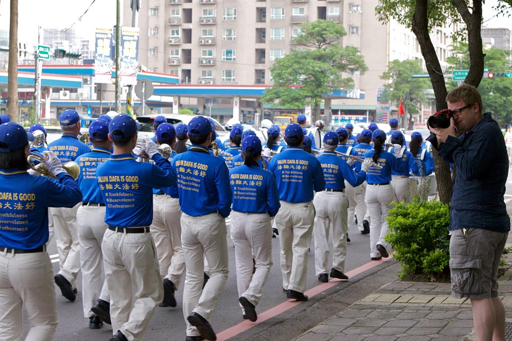 还有来自德州的乔许(Josh),来台湾大约两年,妻子是台湾人,看到天国乐团壮观的游行队伍,停下脚步拍摄许多画面。他表示,听说过法轮功但不是很了解,接下英文介绍资料的他表示,会好好了解。