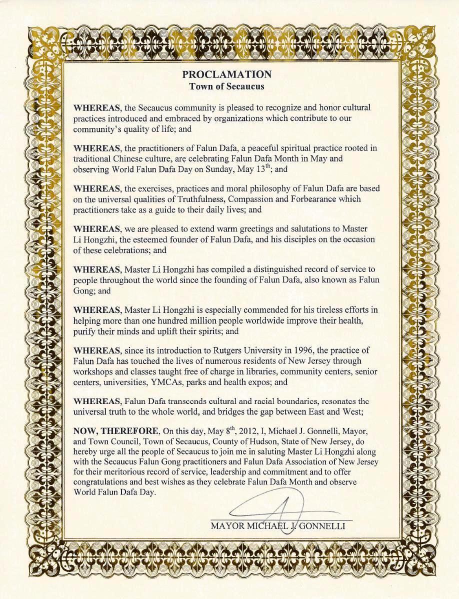 大型集体炼功之后的庆祝活动一开始, 宫奈立先生和议员碧璐女士即代表舍考克思市居民祝贺“新泽西法轮大法月”和“世界法轮大法日”,并由碧璐女士全文宣读褒奖状,感谢法轮大法的创始人李洪志先生为全世界上亿人的身体健康和道德升华所做的无私奉献,也感谢新泽西的无数法轮功学员为洪扬大法所做的努力。