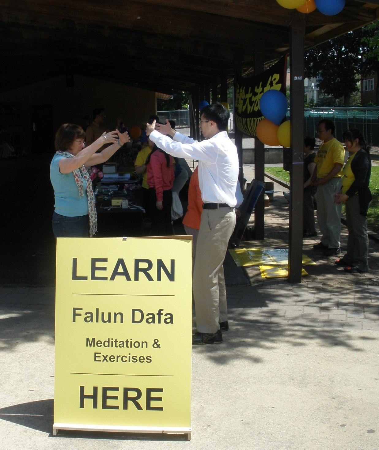 在观看了法轮大法学员的集体炼功和表演后,多位当地社区的民众走到舞台一边的免费教功点,开始学炼法轮功。一位来自中国上海的中年女士,今天是特地来参加活动的,她之前在一个偶然的机会了解了法轮大法。在教功点前,她仔细地向学员们询问动作要领,认真地学习。