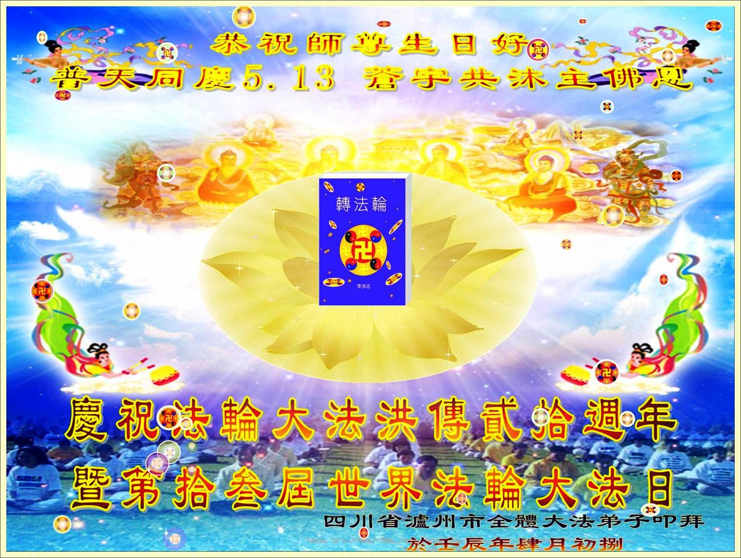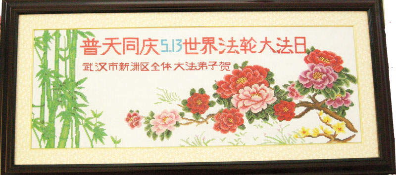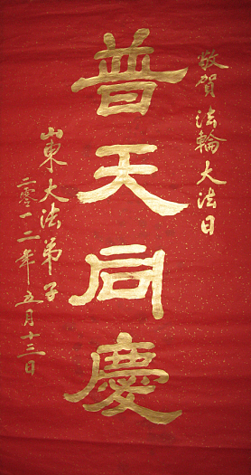 由于前来参加法会的人数众多,法会分为主会场和多个分会场。在主会场的主席台上鲜花芬芳,正中是师尊大法像,两边是写有“法轮常转”和“真善忍”的法轮图形。“正念可救世中人”、“慈悲能溶天地春”的竖幅悬于两边。面对主席台,左侧是横幅“学法不怠变在其中,坚信不动果正莲成”和“精進正悟”;右侧是“大法圆容乾坤正,法王慈悲造大穹”和“法轮常转”,后面是“真善忍”。