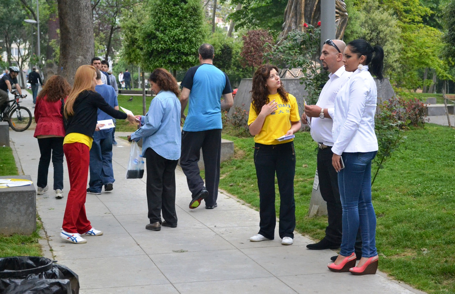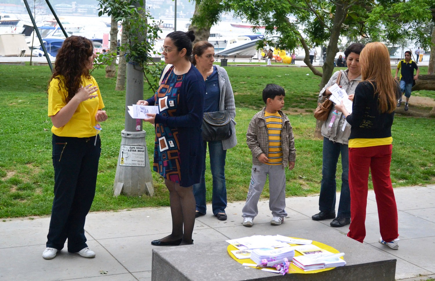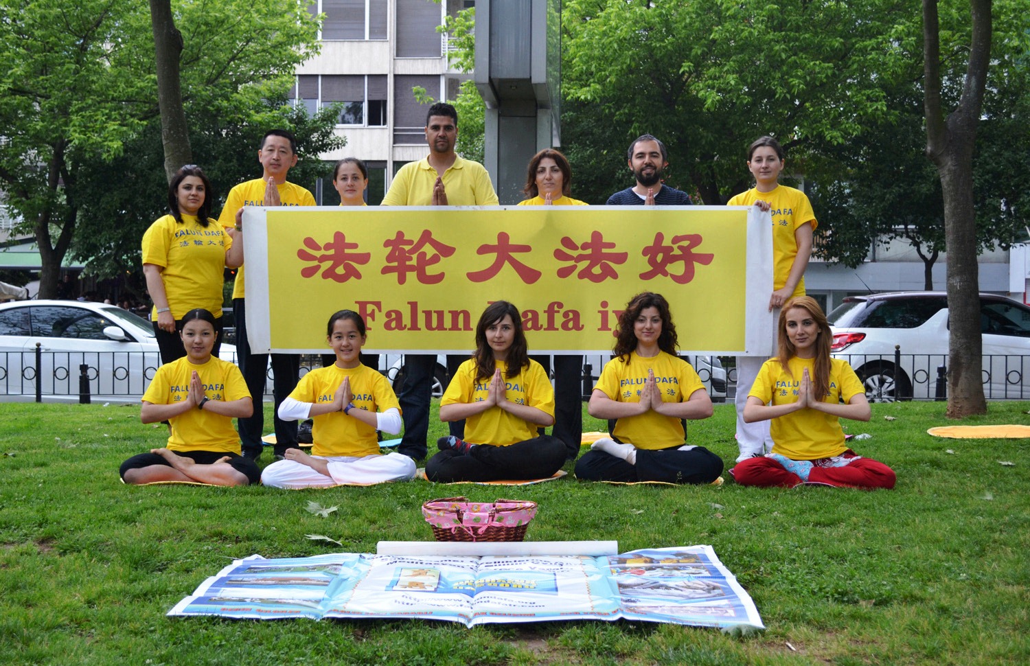 五月的伊斯坦布尔,风和日丽、气候宜人。周末的海滨公园,人来人往、热闹非凡。在公园中心地带宽敞的绿茵地上,身着金黄色T-恤衫的法轮功学员们,在悦耳动听的炼功音乐声中,向人们集体演示法轮功优美祥和的五套功法。