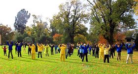 一周前及“世界法轮大法日”当天,墨尔本法轮功学员分别在市中心的两个著名的公园景区举行了大炼功活动,恭贺尊师李洪志先生华诞并向世人展示法轮大法的美好。队伍中有上至八十多岁的老年法轮功学员,也有下至四岁大法小弟子,有已经修炼了十多年的西人老学员,也有数天前成功摆脱迫害抵澳的中国大陆法轮功学员,祥 和的场面打动了路人。