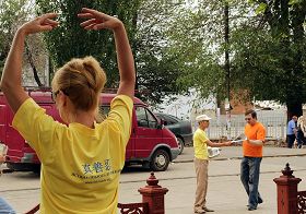 在乌克兰顿涅茨克州,学员们在顿涅茨克州(Donietsk State)的中心公园炼功、洪法。一位中年女士说,她流着泪看完了法轮功学员制作的真相资料。她说:“不敢相信在中国发生着对修炼‘真、善、 忍’的法轮功学员的迫害,共产党是非常邪的,只要有共产党的地方,老百姓就不会有好日子过。”最后,这位女士请了一本《转法轮》,希望能更深入地了解法轮功。