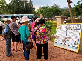 素如说:“我平常利用假日或休假来到景点炼功或举展板,今天第一次开口劝三退,稍早有位大陆女同胞接过真相材料后,迟迟不肯离开,眼睛一直盯着我望,可眼神带着期盼。于是我问她三退了没,她说早与共产党没关系了,也没入过共产党。”素如问她:“小时候可戴过红领巾?入过少先队?”“呀,入过少先队。”素如说:“那我帮你取个化名‘美丽’退了好吗,你要真心诚意退才有用,否则办几次都不算真退,请你记住今天是五月十三日。”对方高兴地说:“五月十三日,美丽是吧,好好,谢谢,谢谢。”