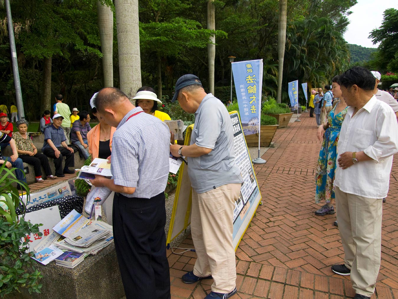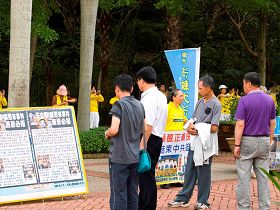 一位六十岁左右的伯伯对学员表示,他是台湾人,知道很多公园都可见到法轮功学员炼功,他常去中正纪念堂看学员炼功,他对法轮功非常有兴趣。与学员挥手道别时,这位老先生说:“法轮大法好!”