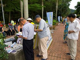 导游刘先生主动向讲真相的学员建议要如何才能让大陆游客放心大胆地接受真相材料并且带回去,刘先生说:“其实他们(指大陆游客)都很想了解法轮功真相,都很想要你们手上的材料,可以说他们对中共高层都是敢怒不敢言。我带团都会跟他们说:法轮功的资料你们都可以拿,拿了之后赶紧放到包包里,带回去旅馆慢慢看。法轮功是合法的,台湾是民主自由社会,这些活动也是台湾民主社会的特色之一。”