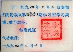 当时气功热,种类非常多,为了规范管理,一九九八年对所有的气功门派从新注册,那次在石家庄东方购物广场会议室的座谈会实际上是从新申请注册的汇报会。直到一九九九年七月二十日,“石家庄法轮功研究会”都是按正规程序合法注册的。当时石家庄公安抓捕石家庄辅导站义务工作人员时,看到注册证书也觉得不可思议,显然明白了迫害的无理。