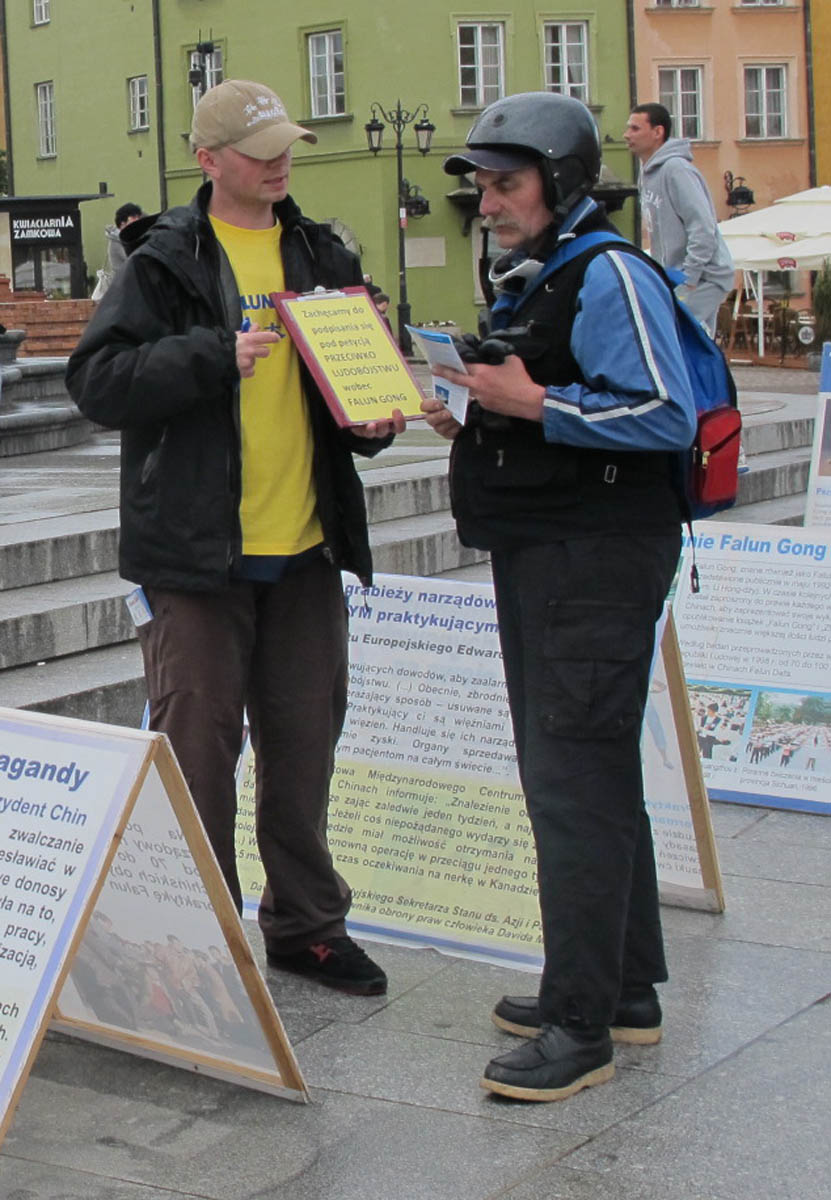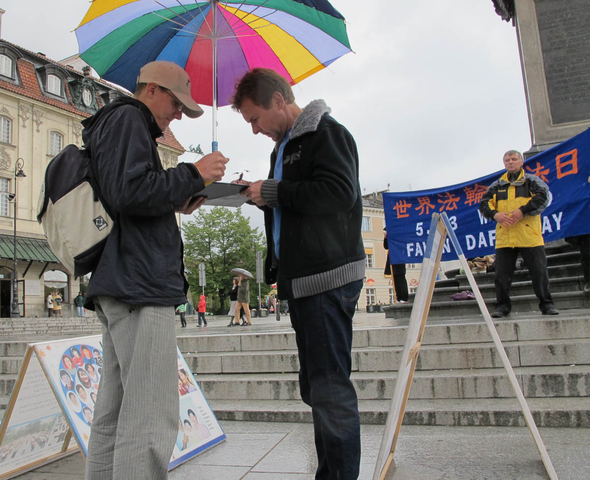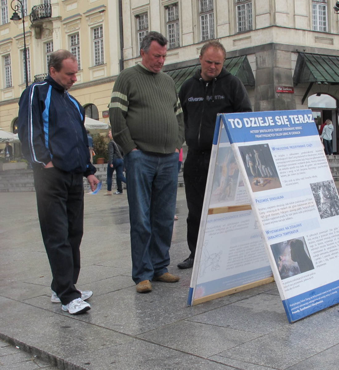 法轮功学员在古城打出一面中英文条幅,上写“5.13世界法轮大法日”,吸引了很多人的目光,不少人走上前询问并仔细观看,法轮功学员用亲身体会向他们讲述法轮大法的美好,讲述法轮大法在世界上的洪传,讲述法轮大法如何提高人的道德观念进而带来身心健康、社会稳定和世界和平,讲述每年的五•一三因此被定为世界法轮大法日。很多波兰人对此表现出极大的兴趣。