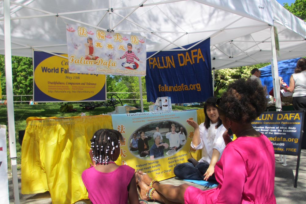 【明慧网二零一二年五月十七日】二零一二年五月十三日是世界法轮大法日。在美国纽约州首府奥伯尼的华盛顿公园,适逢一年一度的郁金香节在市政府的主持下隆重举办。一如既往,当地法轮功学员也申请了一个展摊位,把法轮大法的美好介绍给社区的人们。