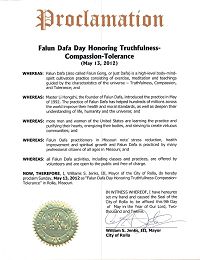 【明慧网二零一二年五月十七日】美国密苏里州罗拉市(Rolla,Missouri)市长威廉斯·简克斯 (Williams S. Jenks)于近日颁发褒奖令,褒奖法轮大法,宣布二零一二年五月十三日为密苏里州罗拉市法轮大法日,颂扬真、善、忍。
