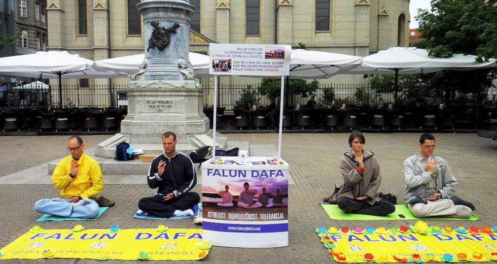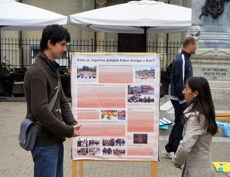 克罗地亚的大法弟子在首都萨格勒布市中心开展纪念活动。向当地民众介绍法轮功,并揭露中共对法轮功持续十三年的迫害