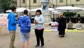 一位老人周末散步来到这里,接过学员递过来的真相传单后说,自一九六三年以来,他一直对中医和气功感兴趣。他相信,那是植根于中国传统文化中的“真实的东西”。他询问在哪里,以及如何学炼功法,并说:“这种功法是非常好的。我一直说,为了有一个健康的身体,你首先需要有一个健康的精神。回家后,我会仔细的阅读关于法轮功的真相资料。我希望你们的活动取得成功!”当他看到学员发传单给其他人时,他对那人说:“拿去看看。这将对你有所帮助。这是一件伟大的事情!”临走时,他说:“善有善报,恶有恶报。一切都将回到原来的,最好的状态。我们现在正在对自己的将来做出选择。”