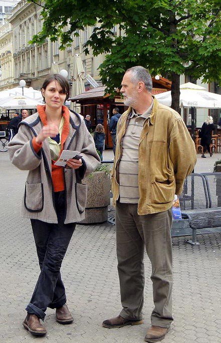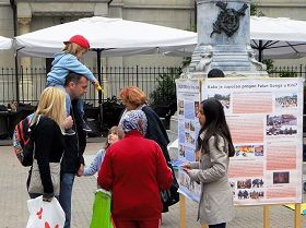周末有许多游客参观首都,醒目的横幅,多彩的莲花也吸引了游人。不少人饶有兴趣地观看学员演示功法。递给他们克罗地亚语真相传单时,他们遗憾地摇摇头说:“我们不会说克罗地亚语。”但是,当学员提供英文传单时,他们就很高兴地马上接过去并认真阅读起来。一对前来度假的美国夫妇和学员交谈,谈到了正在中国发生的关于中共对法轮功学员的残酷迫害,丈夫说,他以前听说过迫害,但他并不知道那么多的详情和细节。他说:“你看,我们没有拿传单,但仍然从你那里了解到了很多的真实而详尽的信息,非常感谢你。“