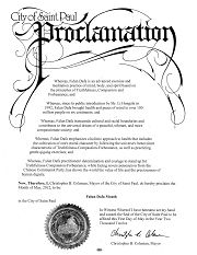 【明慧网二零一二年五月十九日】美国明尼苏达州州府圣保罗市(Saint Paul)市长克里斯托夫•毕•克曼 (Christopher B. Coleman)日前颁发褒奖,宣布二零一二年五月为该市法轮大法月。