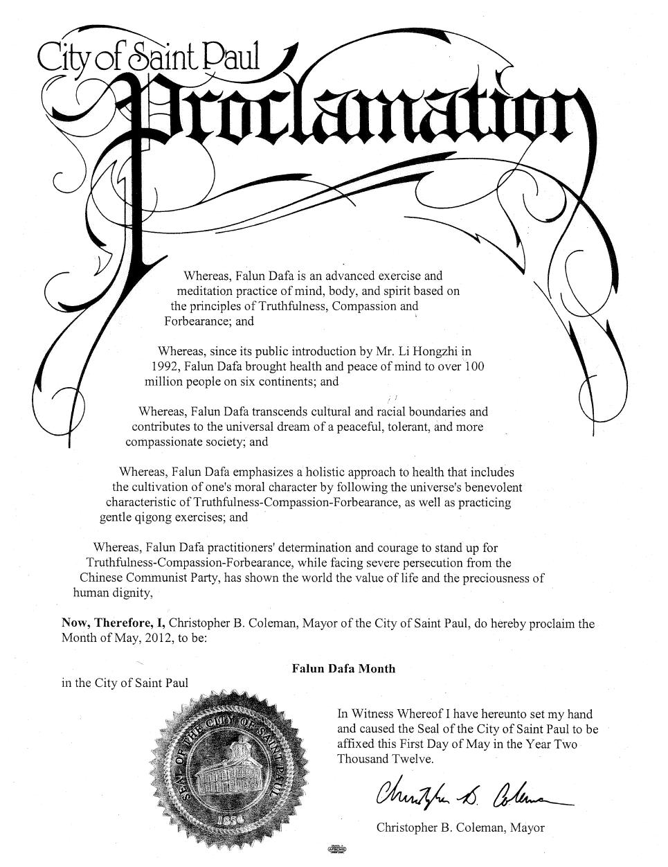 因此,现在,我,克里斯托夫•毕•克曼 (Christopher B. Coleman),圣保罗市市长,特此宣布二零一二年五月为圣保罗市的法轮大法月。