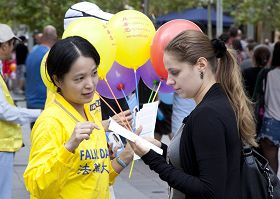 十三日一早,法轮功学员就来到了珀斯市中心的Forrest Chase,摆好展板后,开始演示功法,向过路的行人介绍法轮大法的五套功法及“真、善、忍”修炼原则。