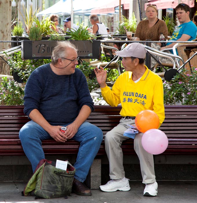 一位上了年纪的妇人说自己平时也打坐,但仍被功法演示所吸引,她说:“金黄色的炼功服和祥和的炼功音乐真的吸引人想看看,到底他们在做什么。他们(法轮功学员)一定很善于打坐,因为他们可以在大街上静下来。”