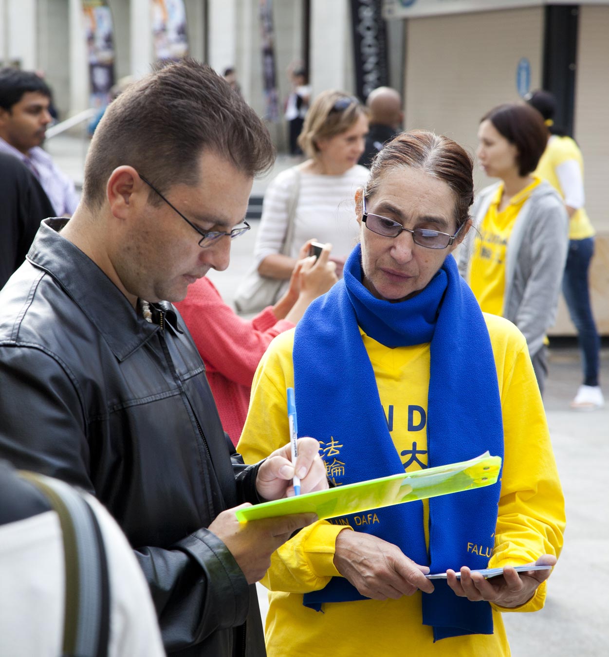 一名来自爱尔兰的游客停下来观看,并且对正在散发传单的法轮功学员说:“我在都柏林看到过法轮大法,我认为非常好。”
