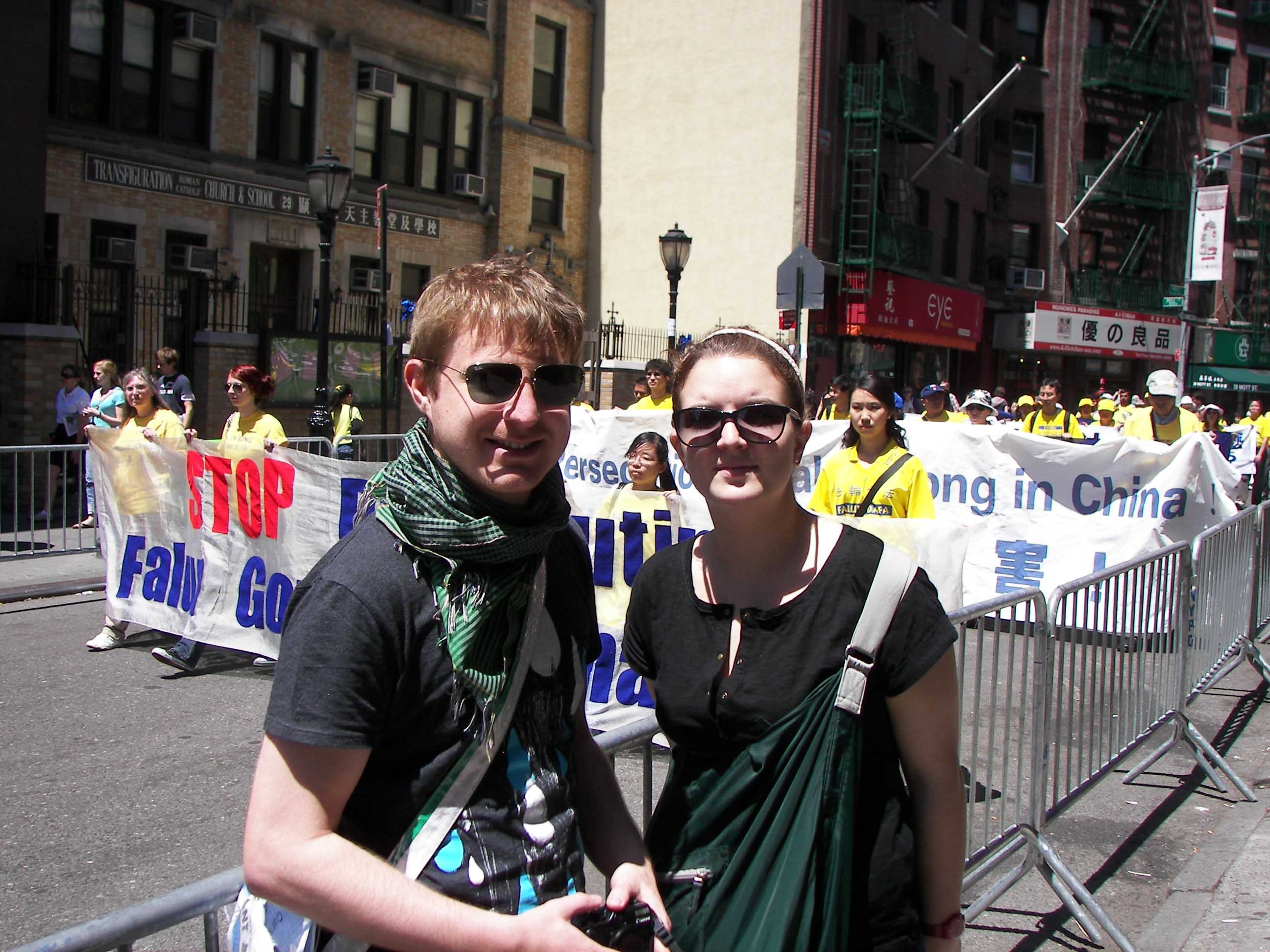 五月十一日,在纽约的街头有两位来自欧洲的小伙子,他们打着一幅用中文写着“世界需要真善忍”的横幅,他们一个是来自俄罗斯的移民伊万(Ivan),刚走入大法修炼一年半;另一个是在美国深造的德国年轻人克利斯蒂昂(Christian),修炼法轮大法已经两年半。伊万说:“修炼后我变得更健康了,我的脊椎病好了,对父母由逆反到尊敬,更重要的是我小时候就有为什么要做好人的问题也得到解答了。”