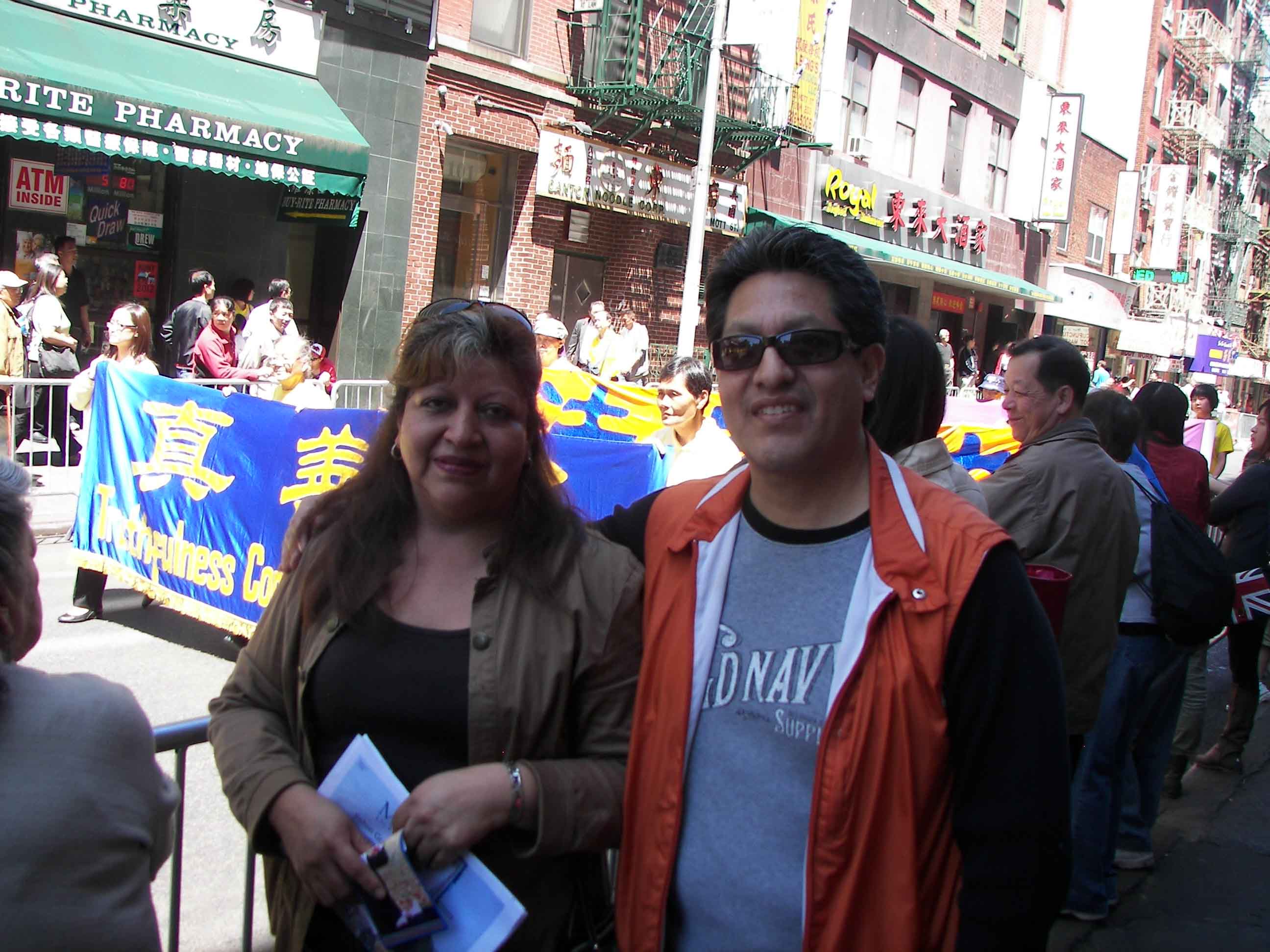 ![]() 来自厄瓜多尔的Pomaqucro 先生和太太一直兴奋地向游行队伍挥手,受游行队伍感染,他们热情向法轮功学员们致意 |