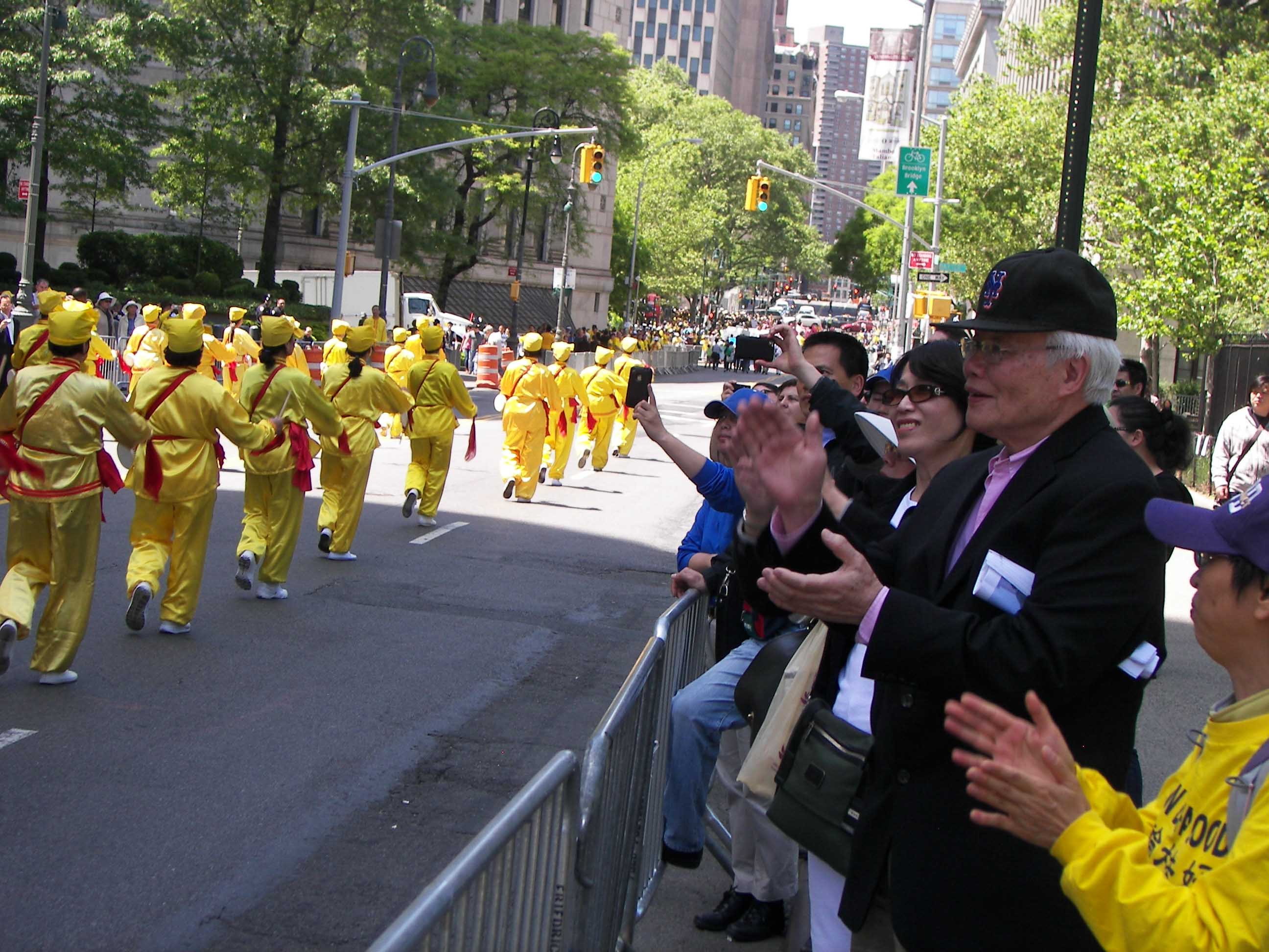 ![]() 七十五岁的老华侨温先生说法轮功真伟大,他向游行的法轮功学员大力鼓掌欢呼 |