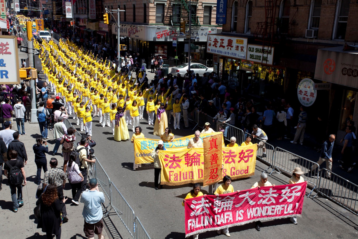 这一天,在美国纽约的曼哈顿,从上午八点开始就有来自世界各地的约七千名法轮大法学员集体炼功,而后是盛大的游行活动。浩大的游行队伍由“大法洪传”、“千古奇冤”、“各界支持三退解体中共”三个方阵组成,游行路线经过十几个街区延绵不断,迎风招展的各种颜色的几千条展板和横幅,传达着法轮功学员的心声:“普天同庆法轮大法洪传二十周年”、“法轮大法好”、“世界需要真善忍”、“历史巨变在眼前,真相就是指路灯”以及“天要灭中共,退党保平安”。游行结束后,法轮大法学员们又在不同地区继续进行庆典活动。下午数百名法轮功学员还在时代广场搭起舞台,以合唱、独唱,载歌载舞等方式尽展才华,表达对大法师父的无限感恩。