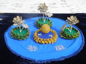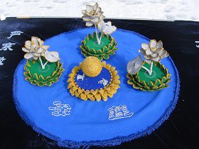 三、三朵莲花,分别坐于三层绿色莲花盘上,象征大法弟子。