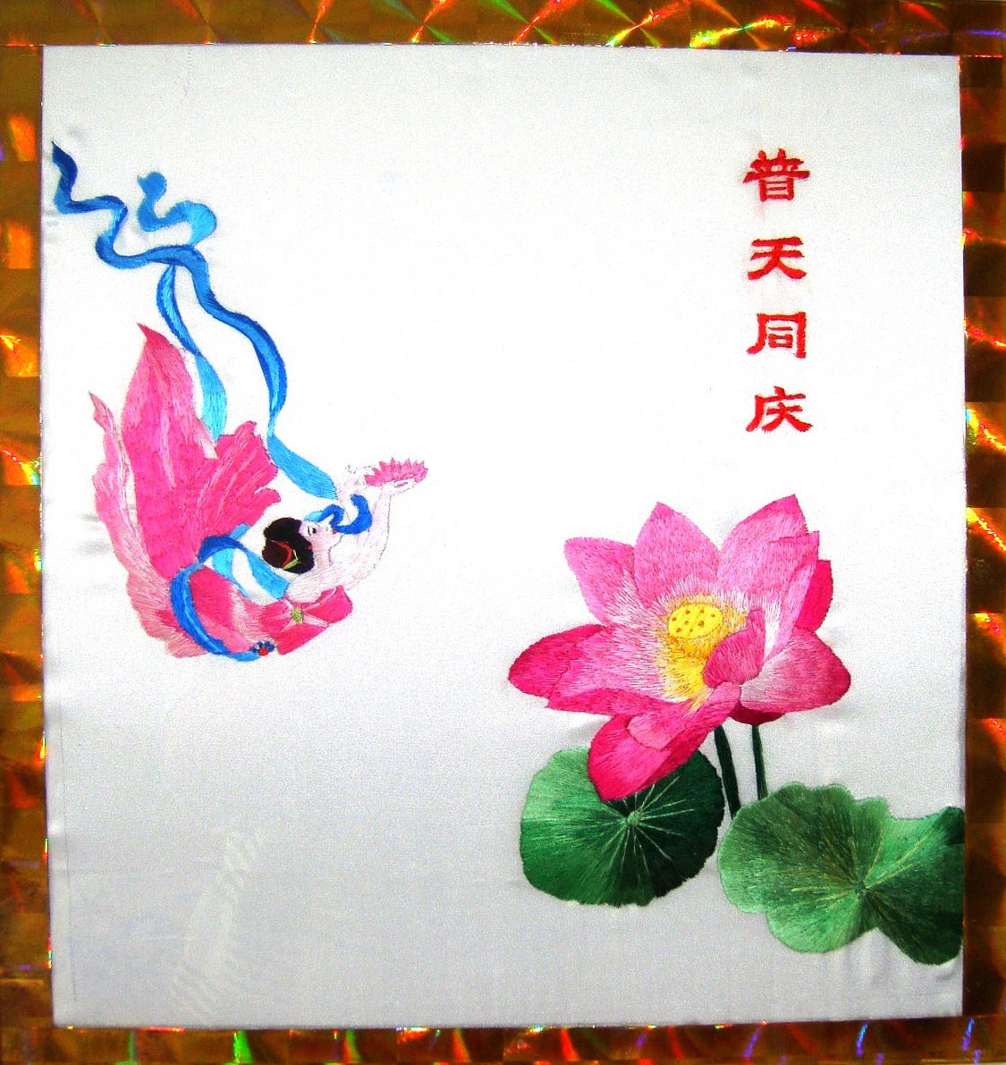 构思:师父从一九九二年在长春传法开始,可以说全宇宙的生命都在注视着,我们就是在这样一个大法洪传、佛恩浩荡下得法的,天、地、人同向;我们有幸听到师尊讲法,俩俩相继而来得法、学法,仙女也在为我们散花;另一方面真正的大法弟子经过严厉的考验走到今天,兑现着自己的誓约,正在完成着史前大愿走向圆满。荷花就象征着圆满的大法弟子的世界。