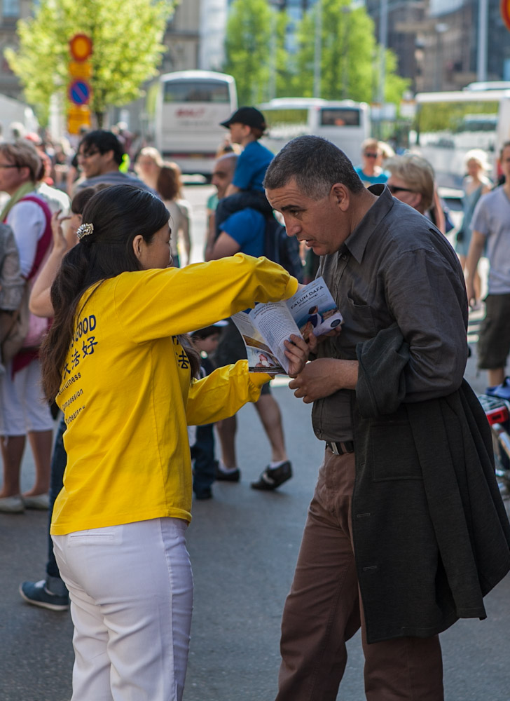 一位上了年纪的芬兰男士告诉学员,他曾经去过中国,在那里他问过一些当地的中国人,“为什么法轮功被说的那么坏,法轮功学员在这里受到迫害?”当地人告诉他,他们其实也不清楚,因为在中国,人们被严禁讨论法轮功,所以民众大都不知道真相,于是,这位男士在这里想从法轮功学员这里得到答案。学员告诉他,在迫害以前,法轮功是非常受欢迎的,但是共产党认为,法轮功所倡导的“真、善、忍”这普世、传统的价值对其是个阻碍,所以对法轮功及法轮功学员进行如此长时间的残酷迫害。他说他喜欢中国现在保留的一些文物古迹,学员解释说,很多中国传统的东西现在已经看不到了,很多东西都只剩下表面了,是失去了原有的内涵的,其实很多传统已经被共产党所摧毁。男士听了觉得很有道理。马上拿起笔来,在征签本上签名。