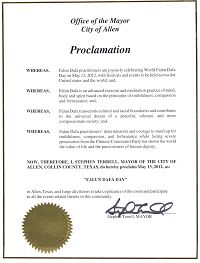 二零一二年五月十三日世界法轮大法日即将到来,美国德克萨斯州艾伦市市长史蒂夫·泰瑞尔宣布五月十三日为法轮大法日,他还称赞法轮大法学员面对中共的迫害,仍坚持“真、善、忍”信仰的精神和勇气。