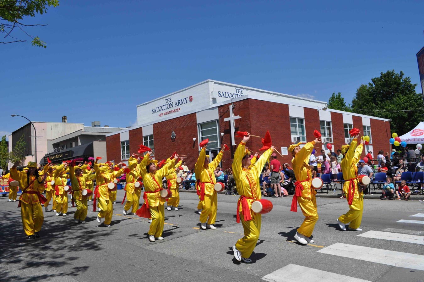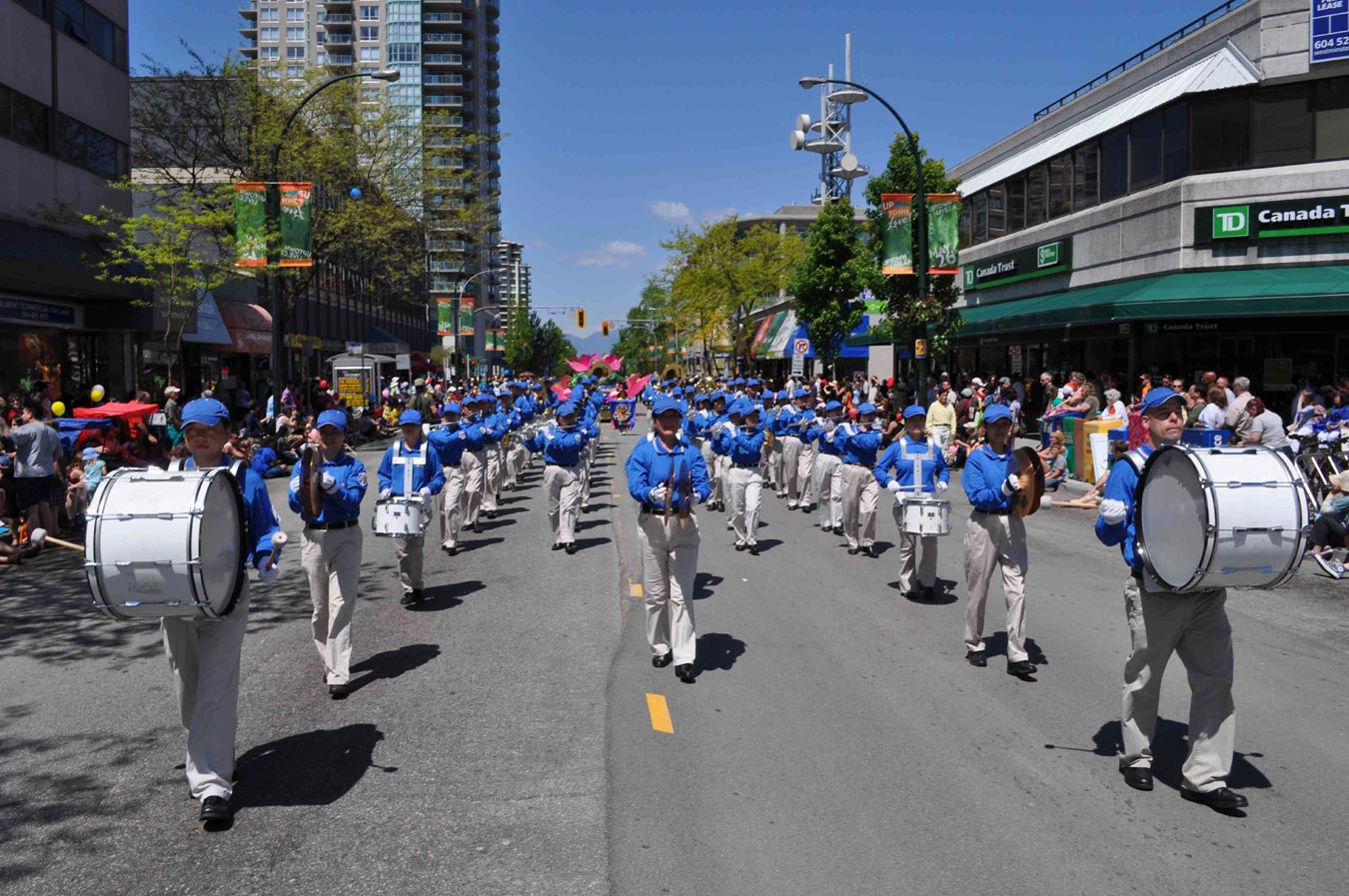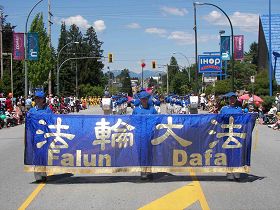 【明慧网二零一二年五月三十日】(明慧记者张然温哥华报道)二零一二年五月二十六日(周六),加拿大卑诗省大温哥华地区风和日丽,气候宜人,是户外活动的好天气。在大温哥华地区新西敏市市中心路两边,上午就坐满了携家带口的民众。海耶克国际大游行(Hyack International Parade)在灿烂的阳光下隆重举行, 其中法轮功学员的游行队伍颇为引人瞩目,有华人观众惊叹:“法轮大法的队伍越来越壮大了!”