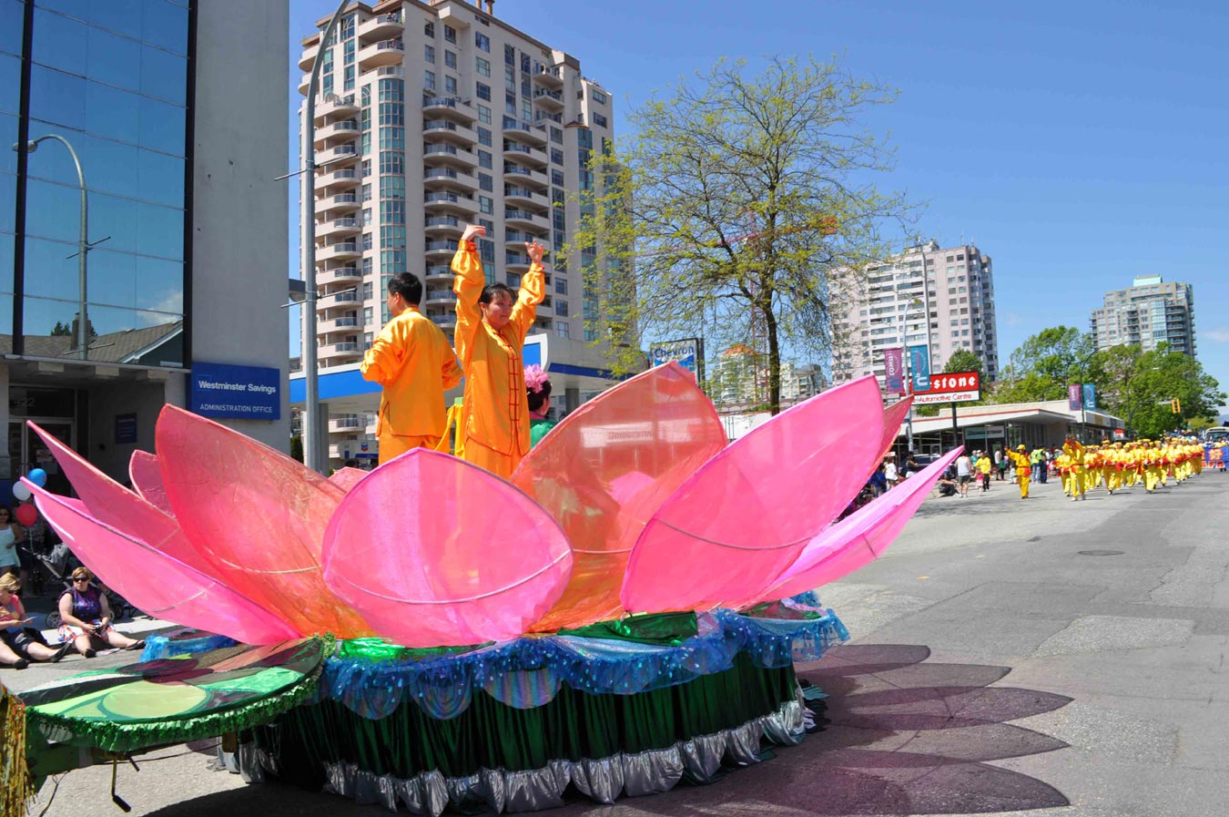法轮功学员的游行队伍由天国乐团、仙女队、腰鼓队、花车等部份组成,备受欢迎,沿途民众报以热烈的掌声和欢呼。天国乐团演奏了《法轮大法好》、《法鼓法号震十方》、《永远的枫叶》等曲目,当法轮大法游行队伍经过主席台时,主持人赞叹“真是令人瞩目的队伍, 让我们欢迎法轮大法团体”。