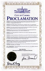 美国印第安纳州卡默尔市市长詹姆斯·布兰纳德于近日颁发褒奖令,褒奖法轮大法,宣布二零一二年五月十三日为印第安纳州卡默尔市法轮大法日,颂扬真、善、忍。
