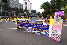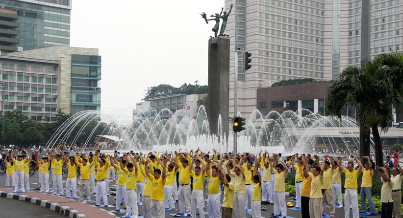 '庆祝世界法轮大法日,印尼雅加达学员在繁华的市区集体大炼功,让人们了解大法美好。'