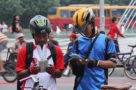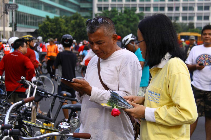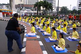 【明慧网二零一二年五月四日】法轮大法自一九九二年五月十三日在中国传出,至今已经弘传世界一百多个国家,无数世人因修炼法轮大法身心受益。五月十三日是世界法轮大法日,为庆祝法轮大法弘传二十周年,让更多人了解大法的美好,二零一二年四月二十九日,印尼雅加达学员在首都“假日无车辆大街”上举办大炼功及讲真相活动。当地几家电台,电视台主流媒体前来报道。