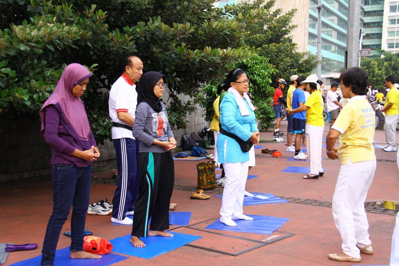 庆祝世界法轮大法日,印尼雅加达学员在繁华的市区集体大炼功,让人们了解大法美好。