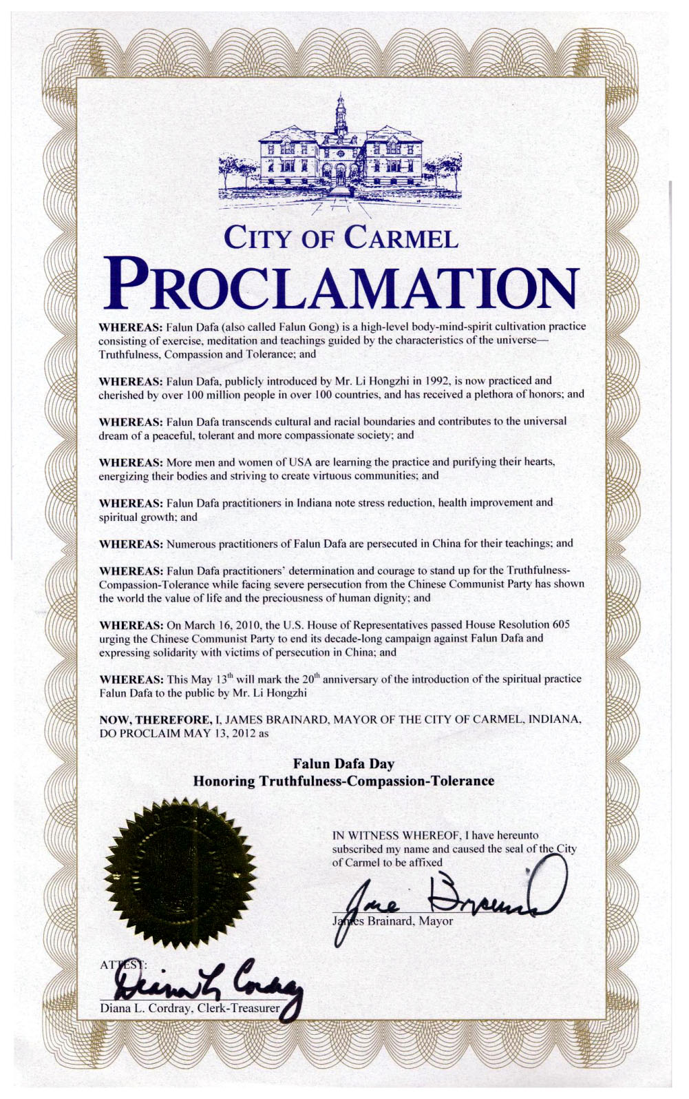 鉴此,我,印第安纳州卡默尔市市长詹姆斯·布兰纳德,特此宣告二零一二年五月十三日为印第安纳州卡默尔市法轮大法日,颂扬真、善、忍。