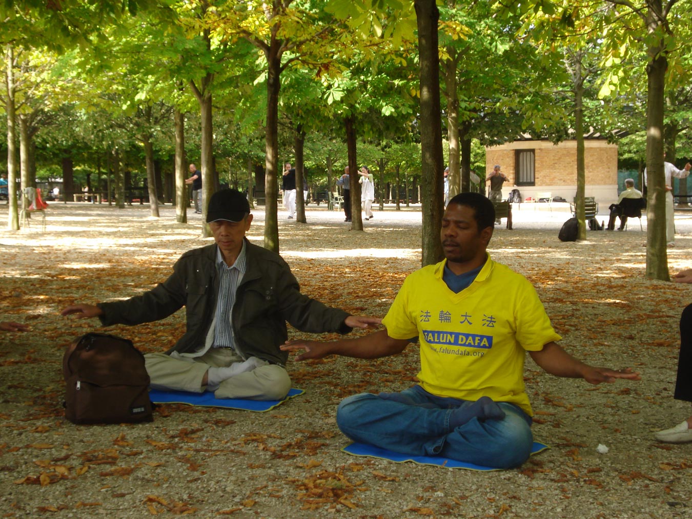 ![]() 艾力(右)和同修在公园里打坐炼功 |